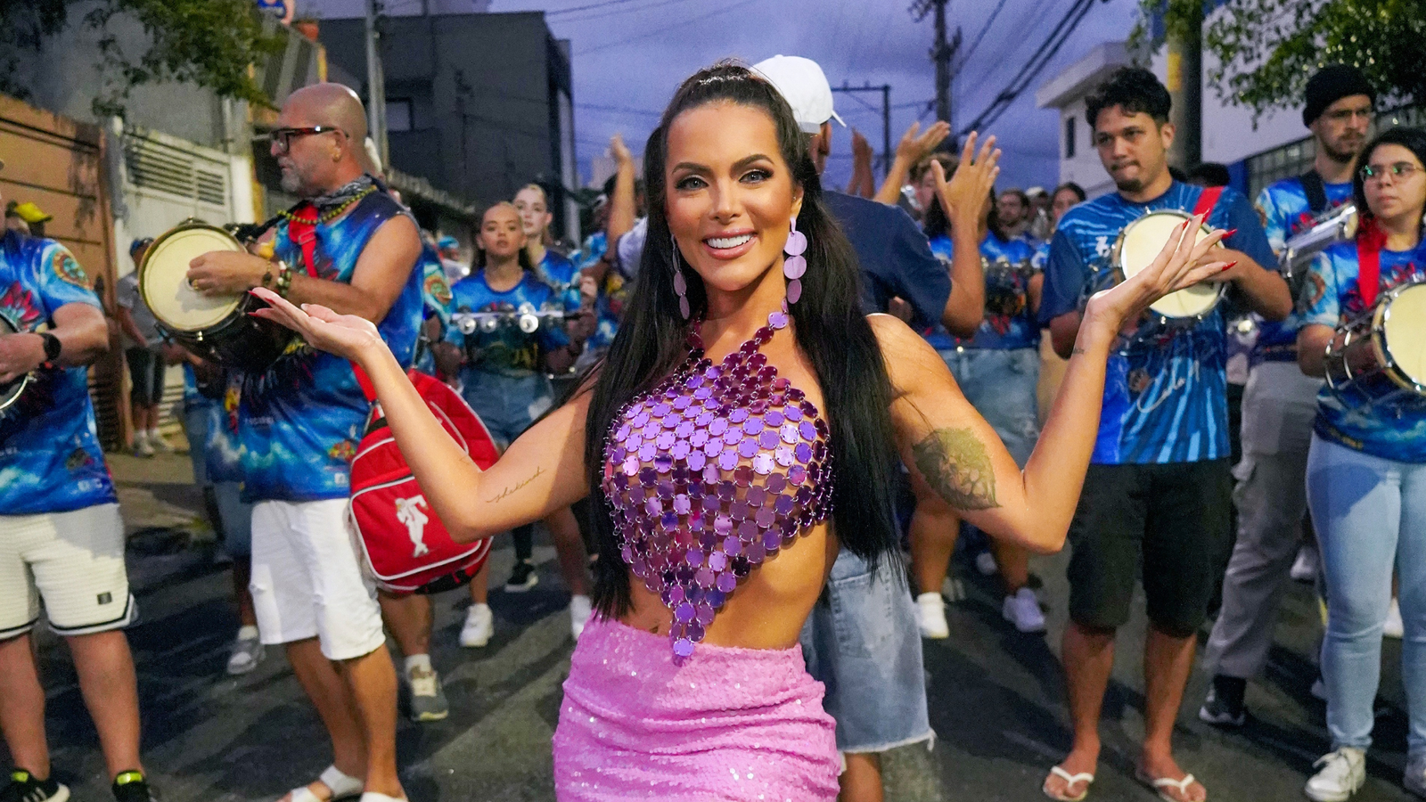 Para a ocasião, a bela escolheu um look ousado e moderno. A produção foi composta por uma mini saia pink com detalhes brilhantes e um top roxo com recortes estratégicos, coberto por pedrarias cintilantes. Nos pés, a bela optou pelo conforto de um tênis branco. O conjunto, arrematado por seu carisma, ressaltou sua presença marcante à frente da bateria, reforçando seu posto como uma das grandes estrelas do Carnaval.