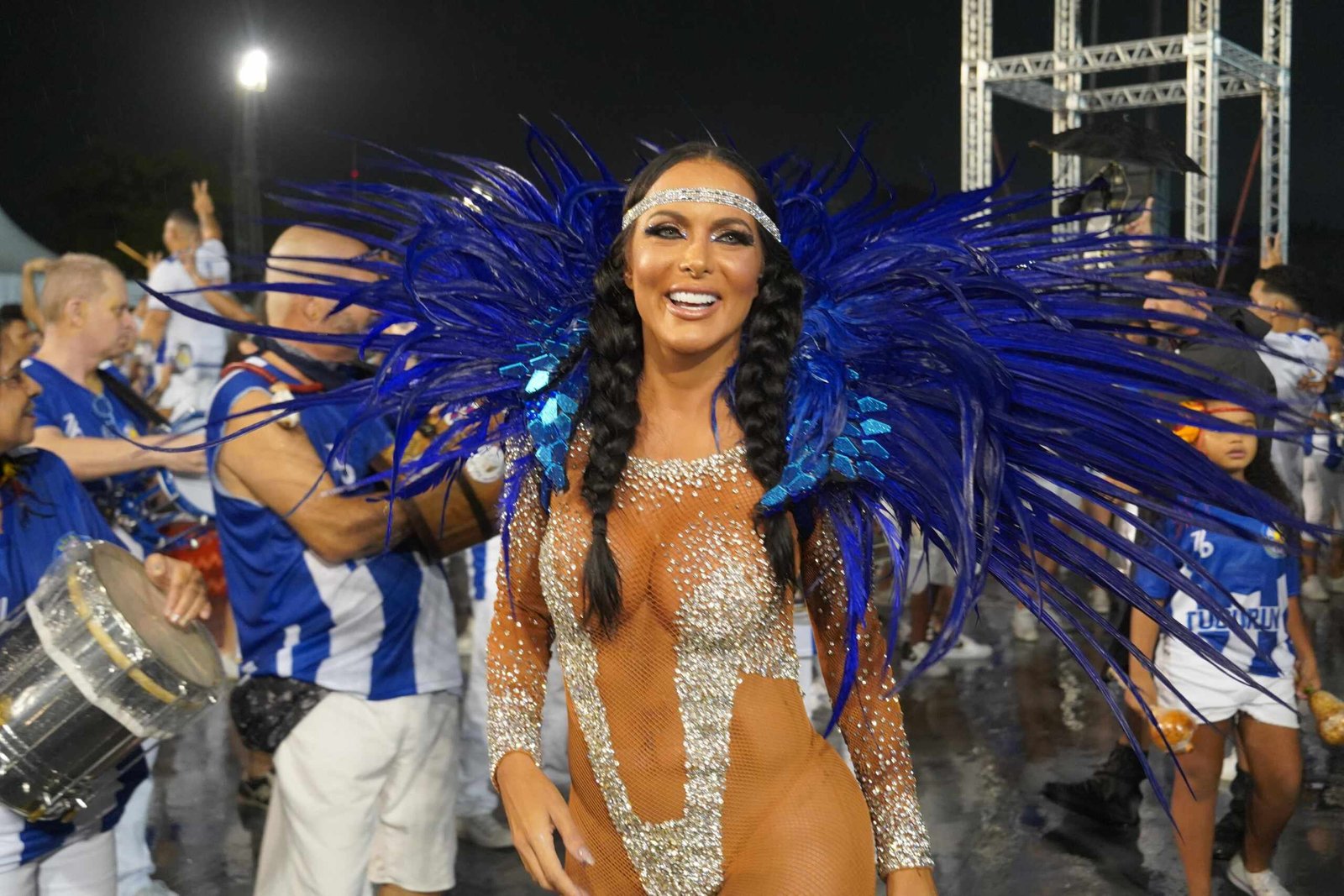 O body inteiramente cravejado com cristais reluzentes iluminava seus movimentos, enquanto plumas majestosas em azul vibrante adicionavam um toque de realeza ao look. Para completar, um acessório elegante na cabeça coroou sua performance impecável, deixando claro que ela veio para fazer história no Carnaval.